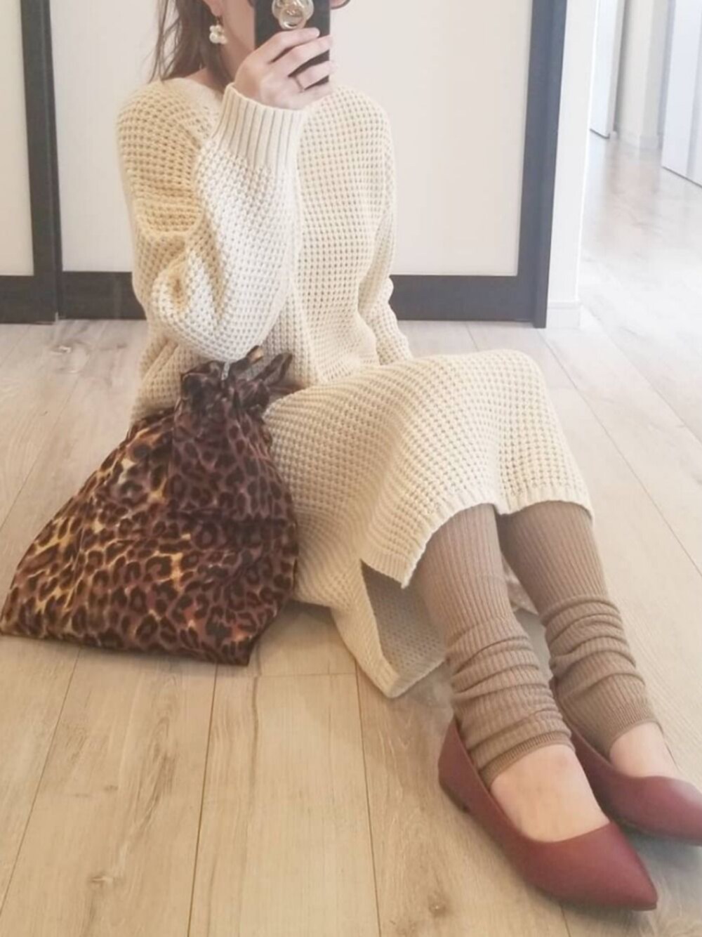 すべてプチプラです。 ワッフルニットワンピース、2990円 レギンス、1500円 靴、1590円 バック、1000円位 ピアス、590円