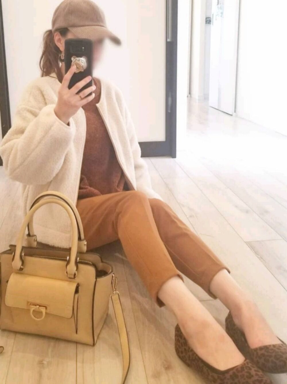 すべてプチプラです。 ボアブルゾン、GU 2990円 ニット、GU 990円 テーパードパンツ、GU 1690円 コーディロイキャップ、GU 990円 バッグ、fifth 3990円 靴、ハニーズ 1580円