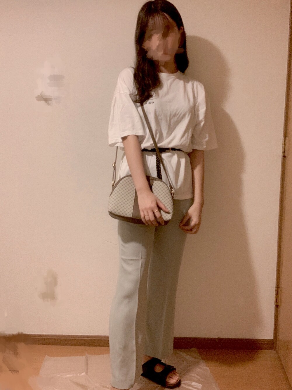 今年のトレンドのミント系の色のパンツを買ってみました。トップスはTシャツですが、ベルトをしたら少しでも大人っぽく見えます!