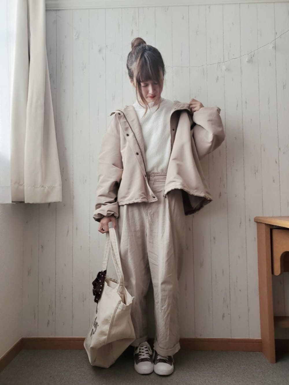 ベージュ×ホワイト×ブラウンコーデ Samansa Mos2のエシカル商品のニットは チクチクしなくて肌触り良き🙆♀️ ニットだから暖かい Instagram→@myumyu6535