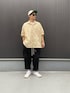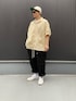半袖シャツ、カーゴパンツ、キャップ、スニーカーで モノトーン。