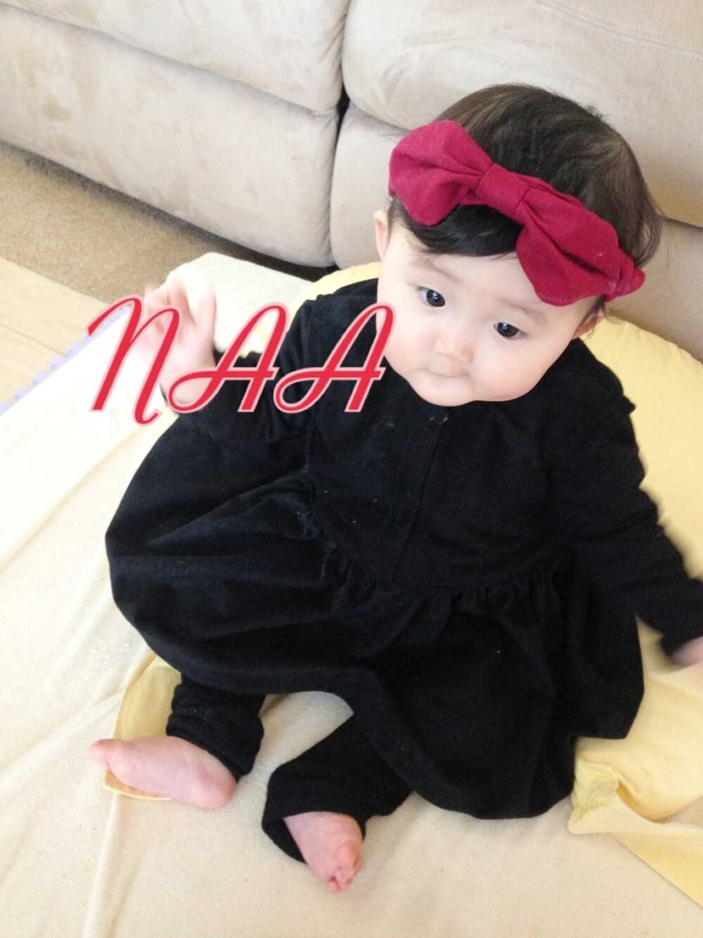 魔女の宅急便みたい! でも頭のリボンとったら喪服みたいw ワンピースはひぃばぁちゃんお手製♡ 結構ギリギリだからたくさん着なきゃ! だいぶ足の力が強くなって少したっちできる〜 けど怖いからそんなにさせたくないってゆー(笑) 本人はたっちできて嬉しそうだけど^ ^