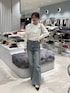 156cm / 骨格ウェーブ / ブルベ夏 ◎靴のサイズ 22.5cm Sサイズ 《 tops 》アイボリー 胸元の大きなリボンがポイントで 1枚で主役級なコンパクトカーデ♡ ドット×リボンが目を惹くトレンドアイテムです🫶🏻 リボンは取り外し可能のため、その日の気分で変えていただけます◎ セットアップ以外にもフリルスカートや デニムでも可愛く合わせていただけます 《 bottom 》 ブルーその他1 Sサイズ 156cmでSサイズ着用しています! 後ろのデザインがポイントのデニムです♡ 程よくフレアなデザインで着やすかったです! ウエストはボタンが2つ付いているため、調整できます◎