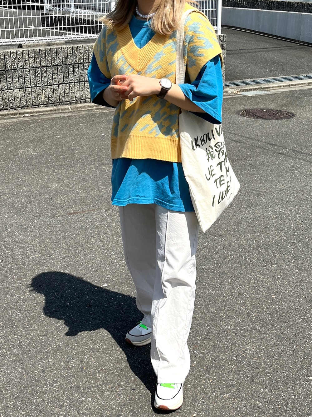 マイカのベスト「ハウンドトゥースショートビッグニットベスト」を使ったコーディネート