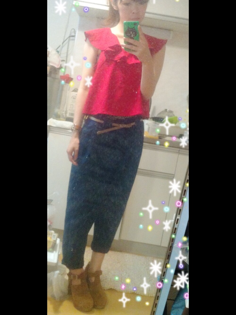kastaneコーデ♡ サボサンダルがセールで、サイズなくてぶかぶかだけど、かわいすぎる♡買っちゃったらzozoに在庫あるという…ショッキング! 赤のトップスも再入荷したらしく、セールで即買い☻ トップス kastane サンダル kastane
