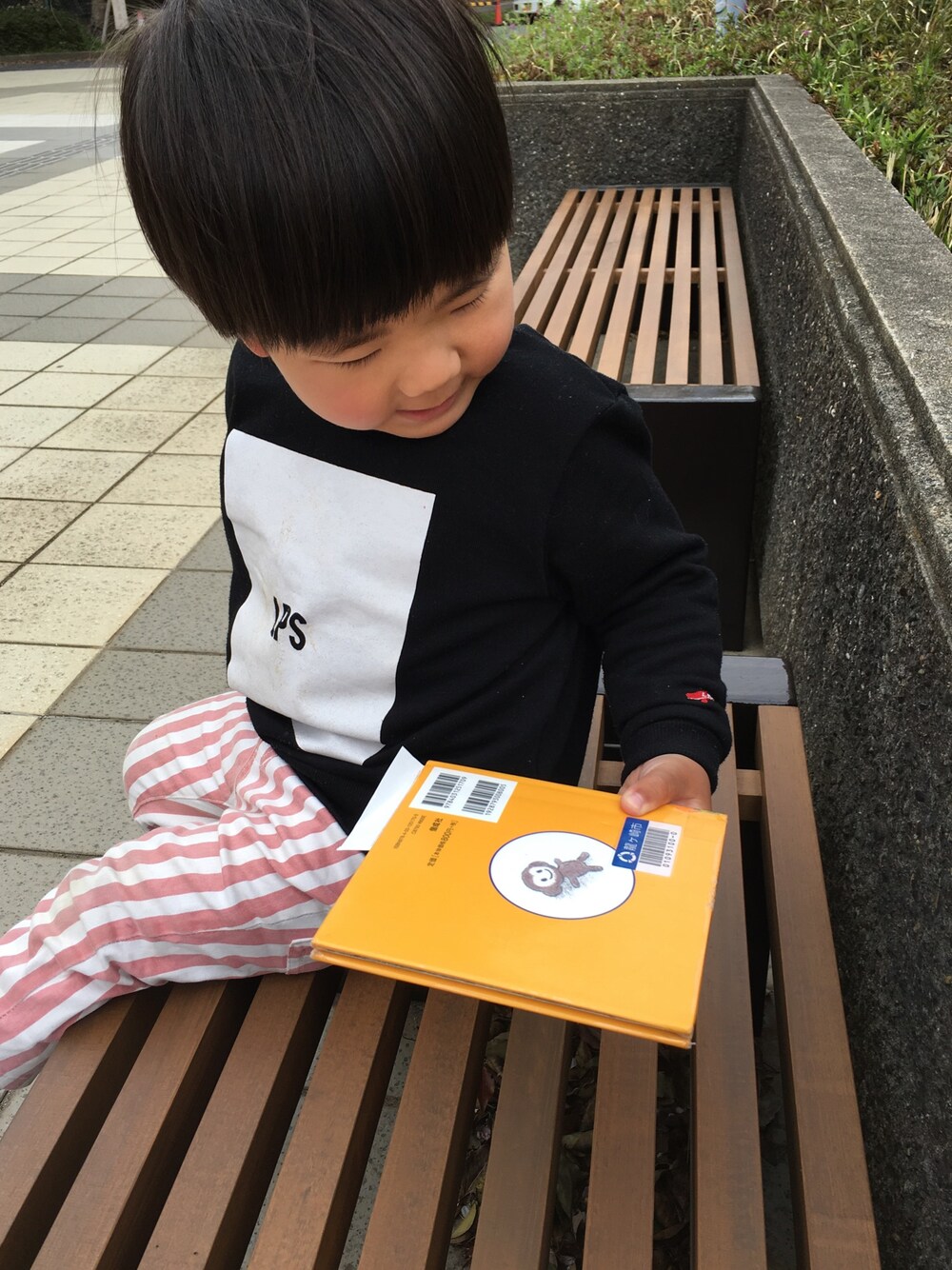 図書館で本を借りました。 お姉さん待ち…。 ベンチに座っているとアリがいて絵本をあげてます😲 🤔食べるかーい🙌