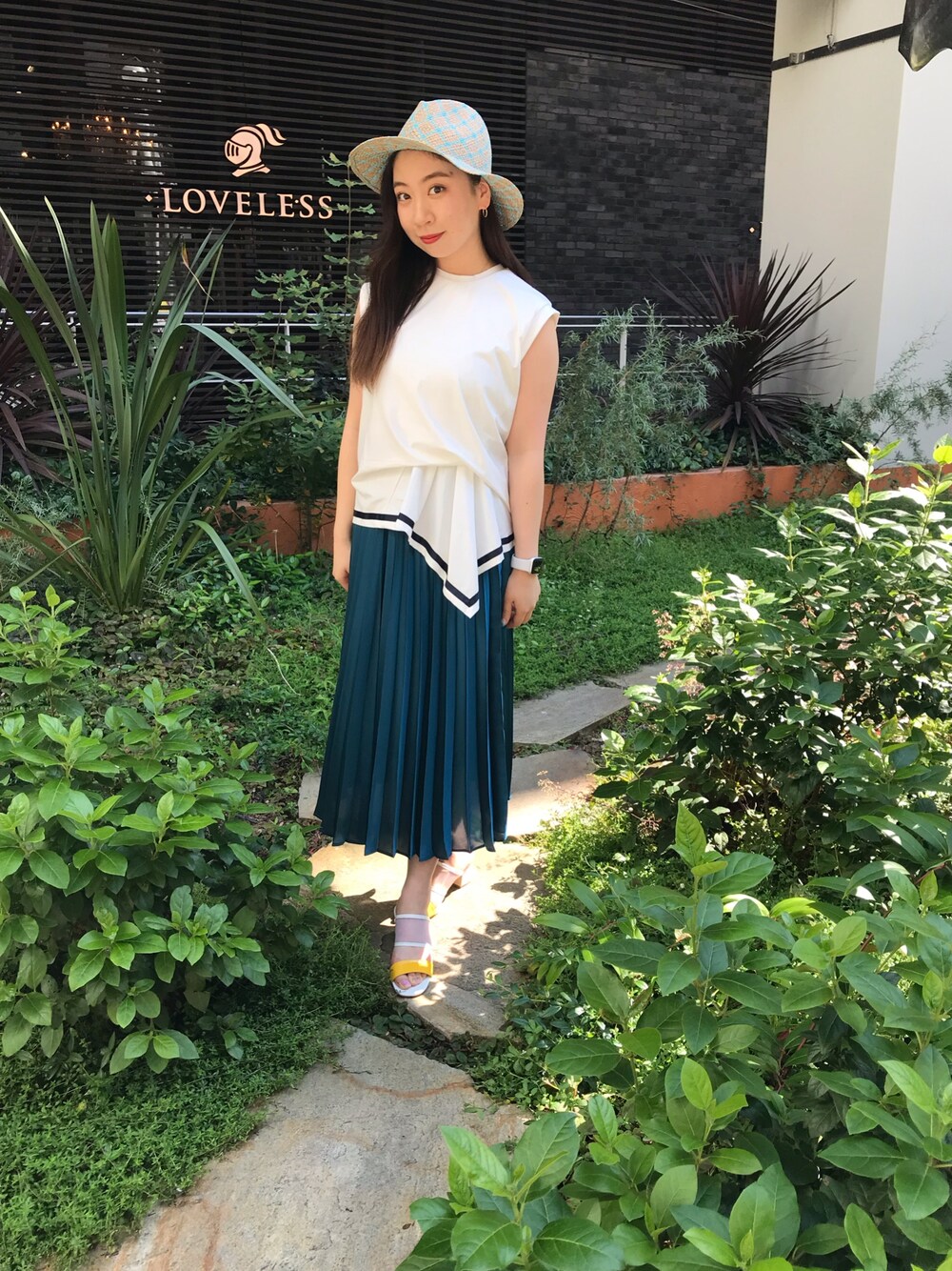 変形のヘムトップスとプリーツスカートのバランスが軽やかに見せる夏コーデ♪