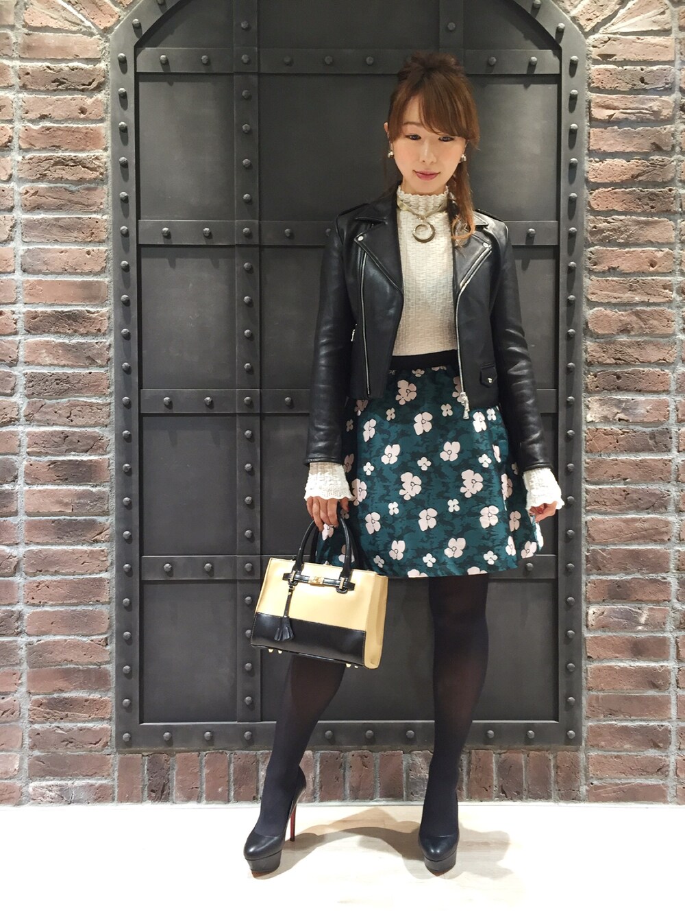 毎年定番で飽きずに着れるレザージャケットを今年らしく着る為にレトロスカートと合わせました。辛口なライダースも程よい分量のギャザーのスカートでふんわり感を出し、バランスの良い女性らしいコーデです。
