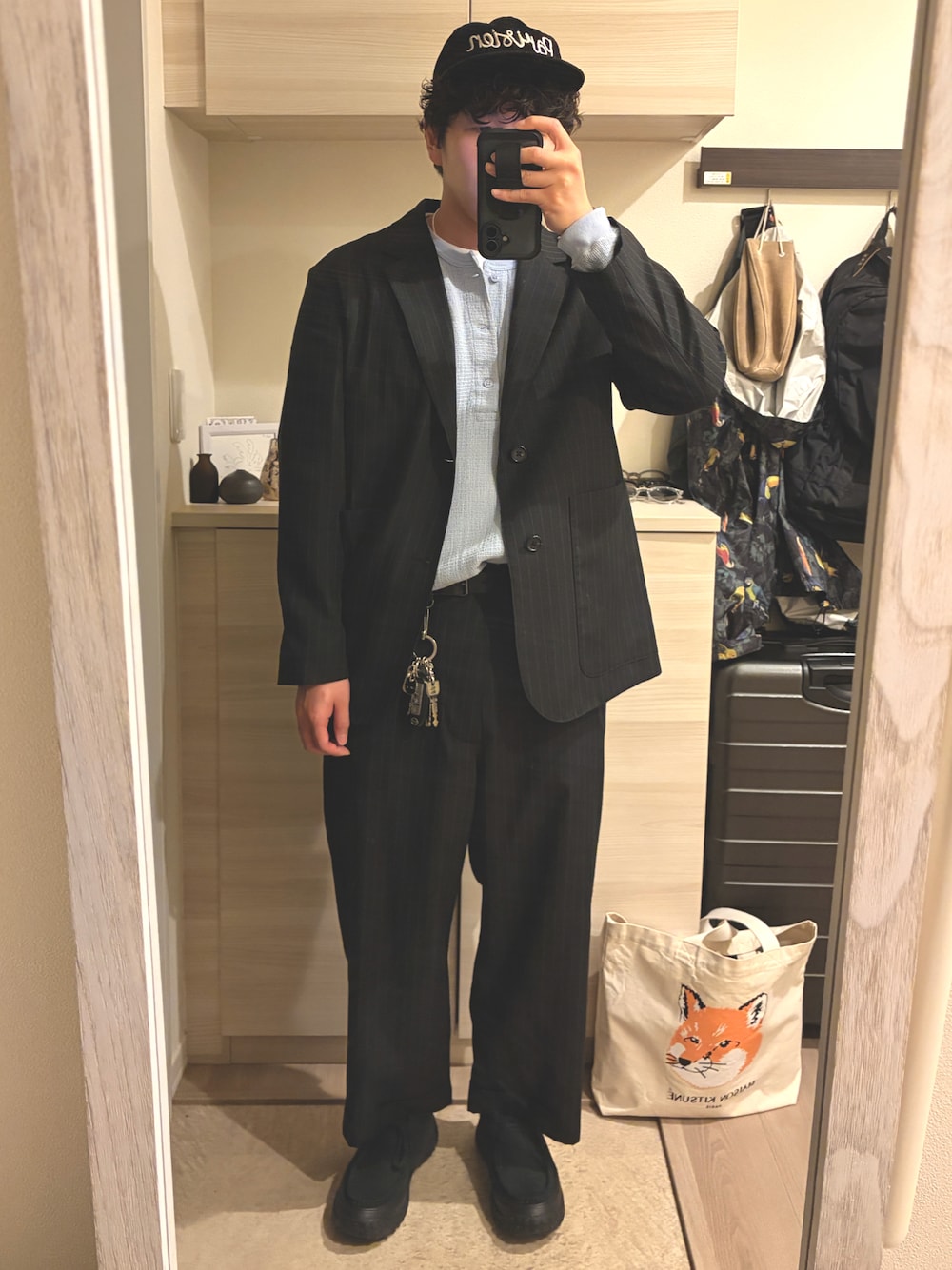 マーガレットハウエルのセットアップをメゾンキツネのキャップとトートバッグでカジュアルに。keenのシューズとジャーナルのヘンリーネックで抜け感を出しました。