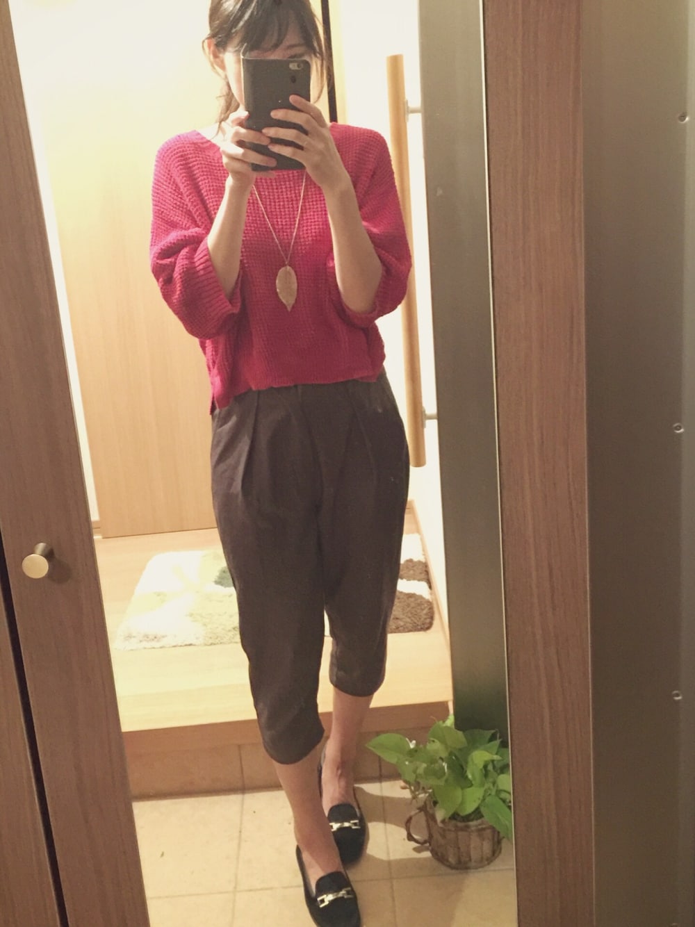 秋らしい、 こっくりした赤色のニットは アーノルドパーマーで購入。 デニムにも合います(^ν^) 金の葉っぱのネックレスは お気に入り。