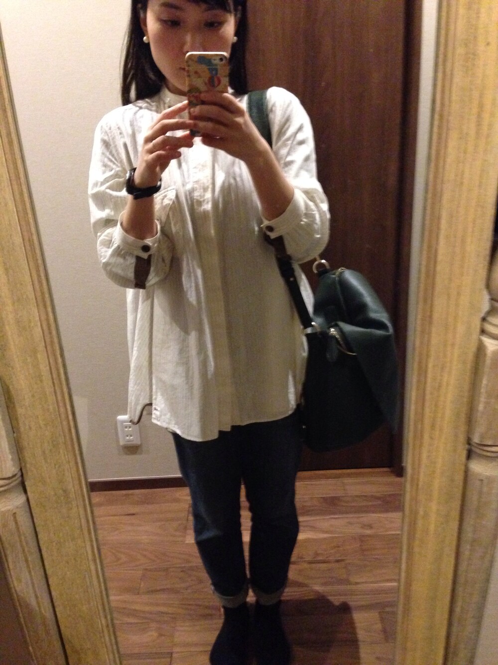 ストライプシャツ / romar quee, ジーンズ / UNIQLO 靴下 / tutuanna 靴 / liflattie ships 時計 / CASIO ピアス と バレッタ / 雑貨屋さん 鞄 / kastane