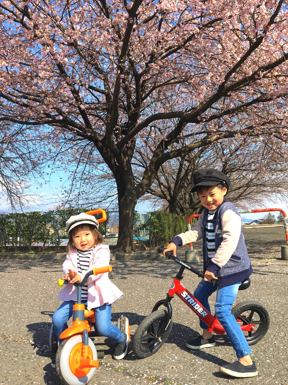 マリンキャップ×ボーダー×デニム 兄妹 リンクコーデ💛❤💙 近所のヘリポートまで 三輪車とストライダーで お散歩🚲 早咲きの桜が満開でした🌸🌸🌸