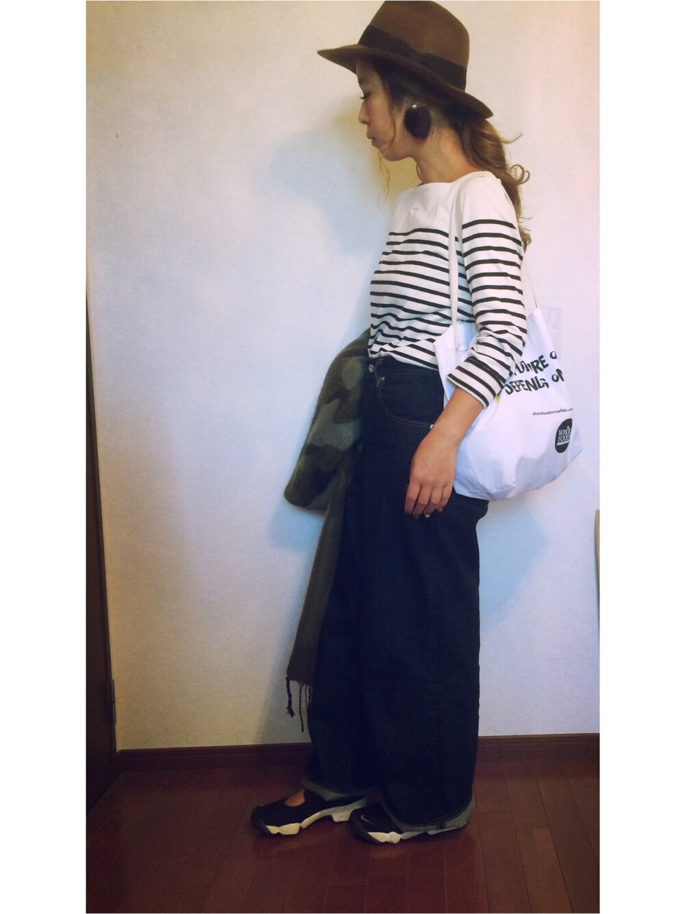 やっぱり着たいワイドパンツ。 👒楽天 👚無印 👖ジャーナルスタンダード 👞NIKE ストール H&M ピアス ハンドメイド
