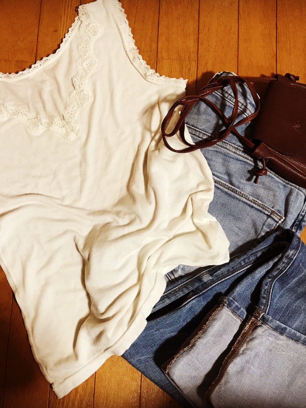 レースタンクでたまには女らしく♡ 女らしくなり過ぎるのは苦手なので、デニムは太めにロールアップしてカジュアルに 相変わらずな小さめポーチ♥︎