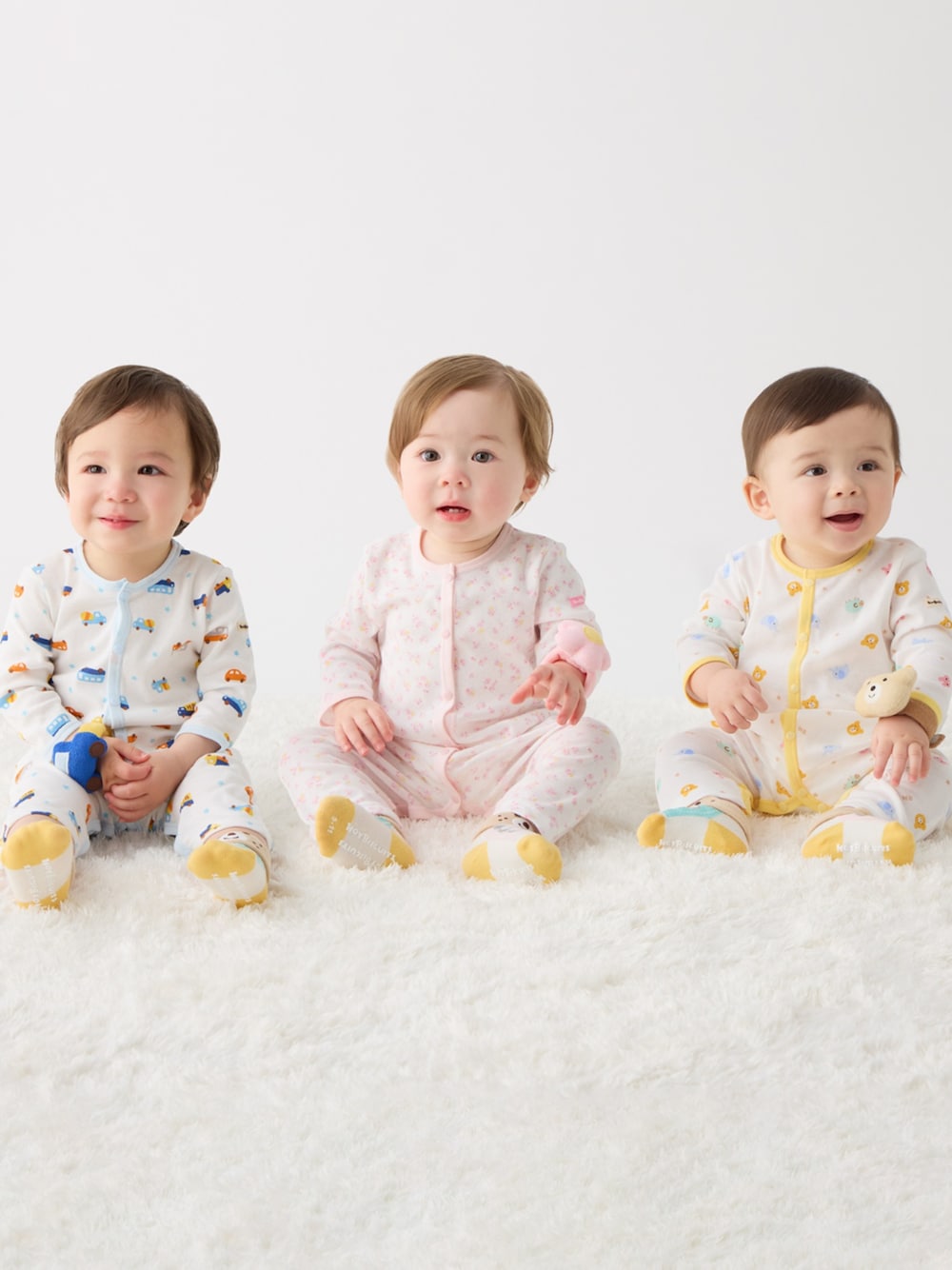 コンビ肌着からのサイズアップとしておすすめのカバーオール肌着。 春や秋には部屋着やパジャマとしておうちでのリラックスウェアとして、冬にはインナーとして長いシーズン着ていただけます。