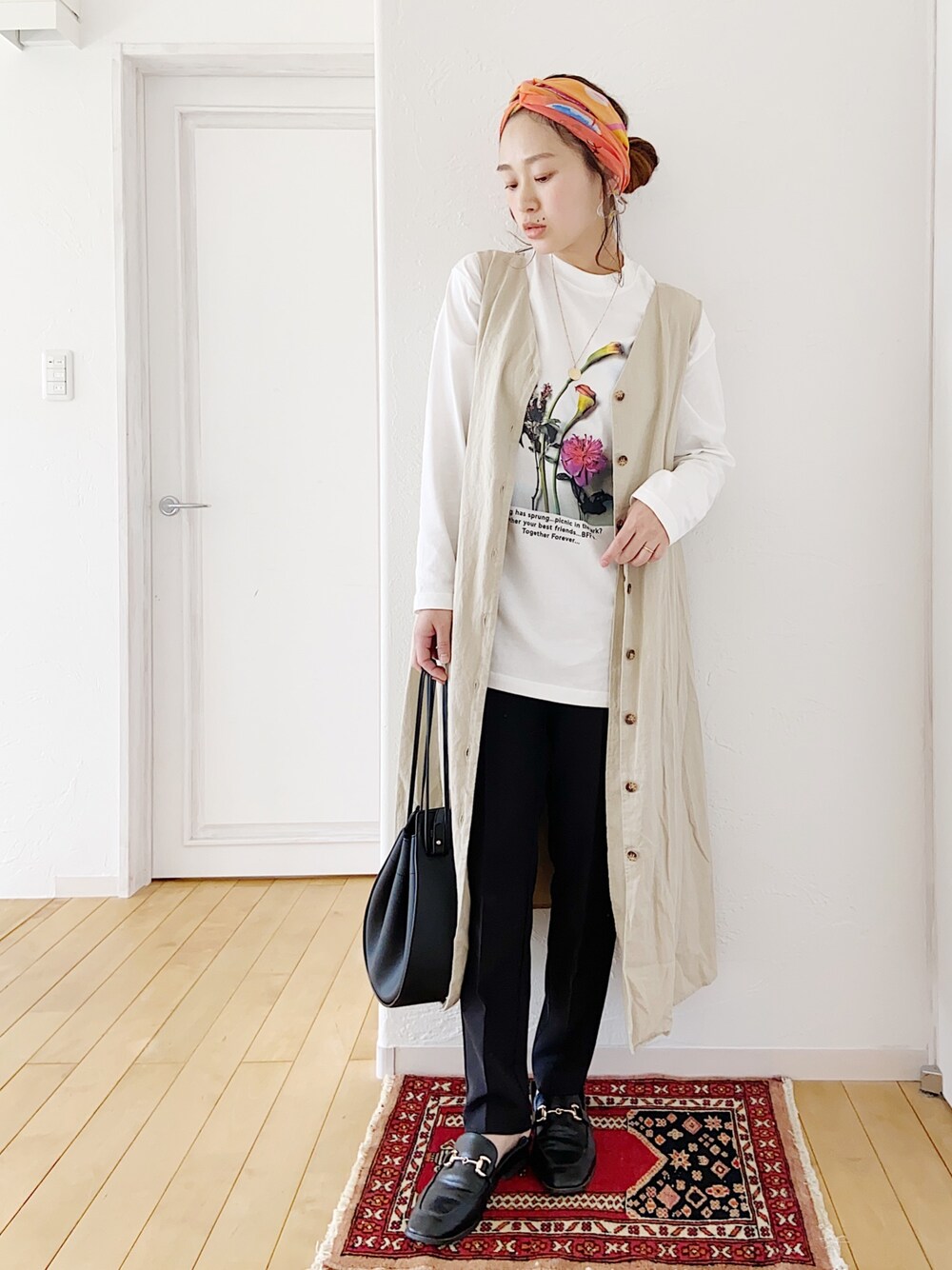 ノースリーブワンピをジレ風に。 ロンTとボトムスはGU。