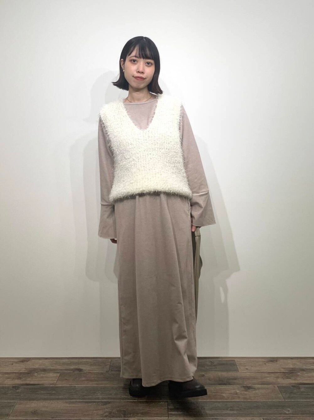 人気のベストを今回はワンピースに重ねてみました〜! ワンピースは155cm one sizeを着用しました🗒️ 少し丈感長めだったので、155cmならcompact sizeのほうが安心して着用できそうです🫡 フェルトのような温かな素材のシンプルなワンピースですが、パイピングや袖がフレアのデザインがポイントになっていて1枚で着ても重ね着しても可愛いです◯