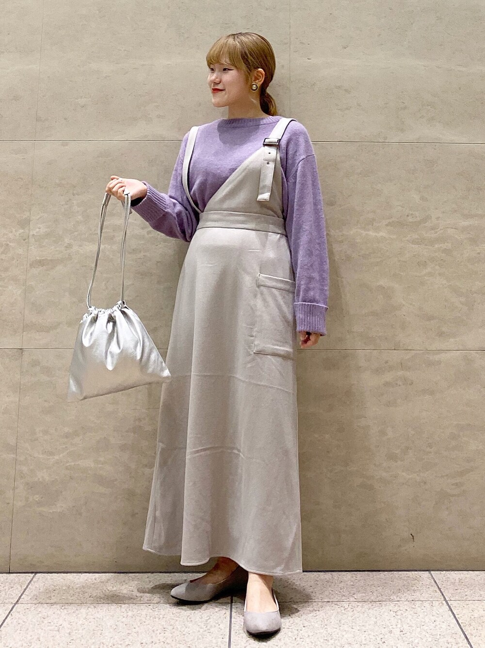 淡色コーデ グレーでまとめて パープルニットをアクセントに🍇 流行りのワンショルのジャンスカは 取り外しでスカートのみでも 使用出来る優れ物です◎