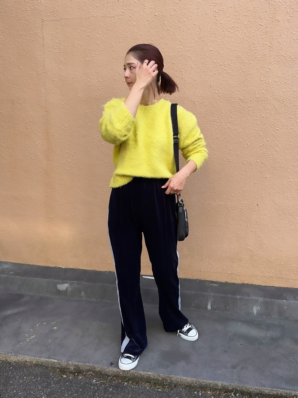 最近のお気に入りニット RASWのモワモワニット🧶 絶妙カラーのイエローもお気に入り🐥 トラックパンツとも相性ヨシです