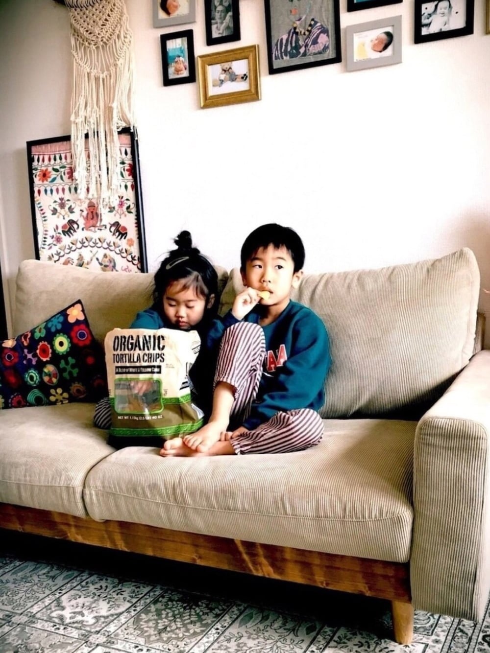 久しぶりのリンクコーデ♡ 服全然見えてないけど…ww 息子テレビに夢中。 娘お菓子に夢中。