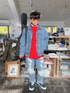 赤を差し色にした デニムのセットアップスタイル🍎