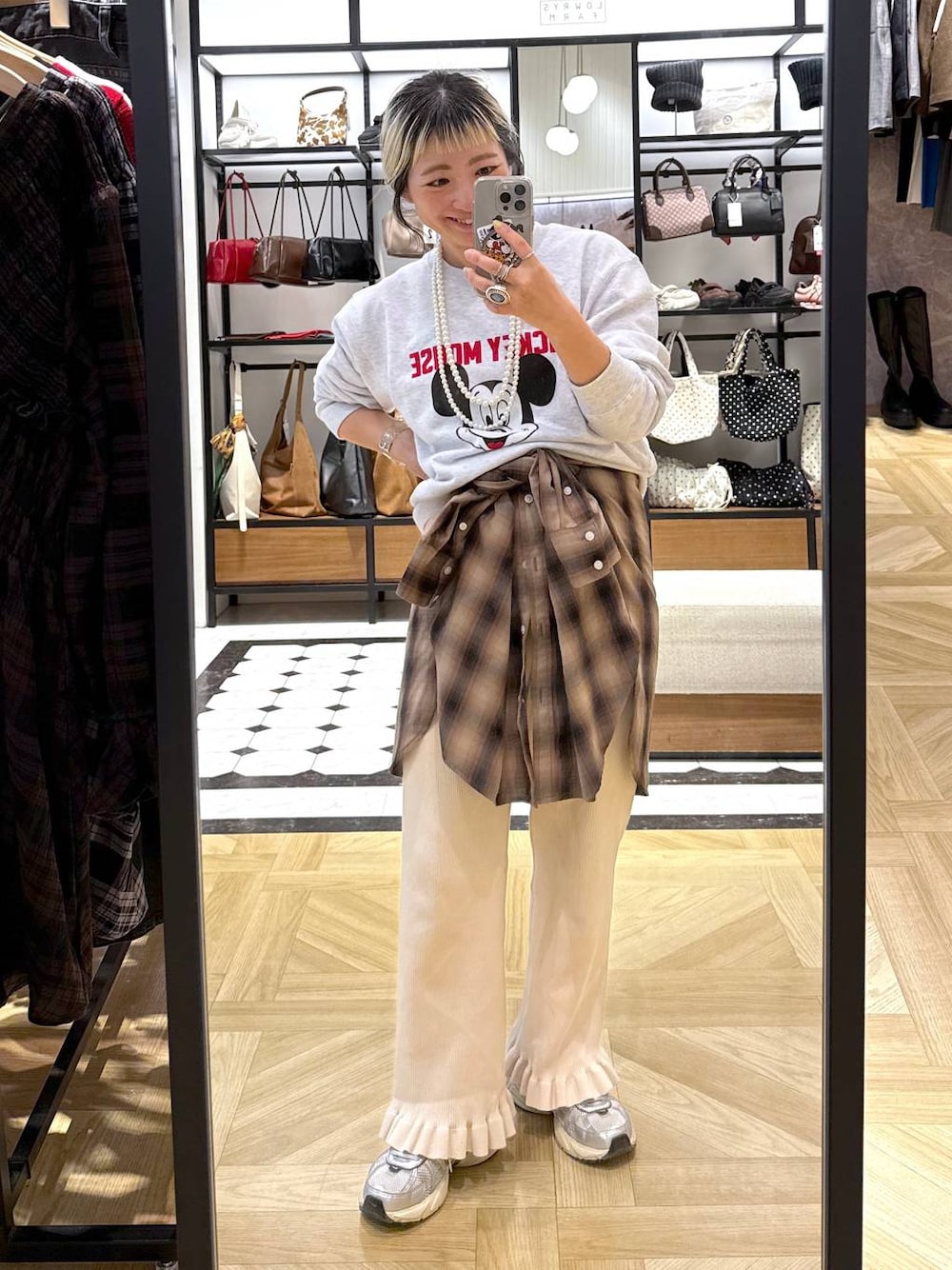 mickeyコーデ♡ 【スウェット】 そこまで厚手じゃないので、今時期から長く着れます☺️ カラーによって柄が違うのもカワイイ! 腰回りは隠れますが、リブを折り返せばコンパクトにも着れます!! 【シャツ】 毎年大人気のBIGシャツ! 今年も肩紐ストラップが付いているのでビスチェアレンジもできます!! サラッとした生地で、とても着心地が良く、いろいろな着方が出来るので1枚あると重宝します! 【パンツ】 裾がフリルになってるのがポイント! わりと細めのパンツです! でもニットなので伸びが良くて履きやすい☺️ 150センチの私は一つ折りで履いてます!