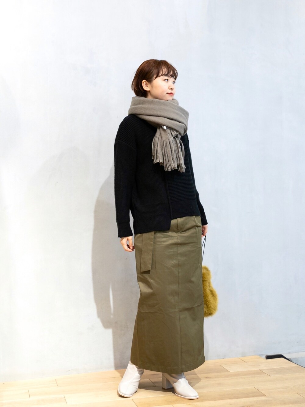 ブラックのニットとカーキのスカートでシックな印象を意識しました◎ シンプルコーデにも見えますが、切替デザインがポイントです! いつものニットに飽きてしまった方はデザインニットを使ったコーディネートを楽しみましょう☺️