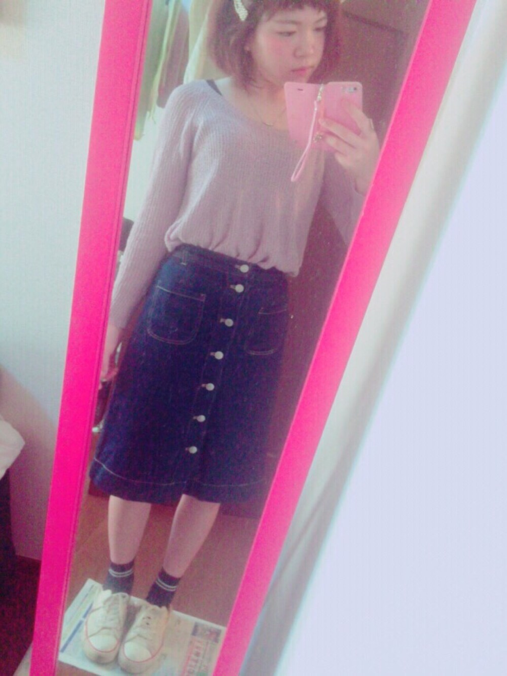 今日は春感満載🌸 レトロガールコーデ パープルの薄いニット900円くらいで デニムスカート1200円とかやった気がする! スカートの長さと形ちょー好み💞