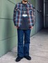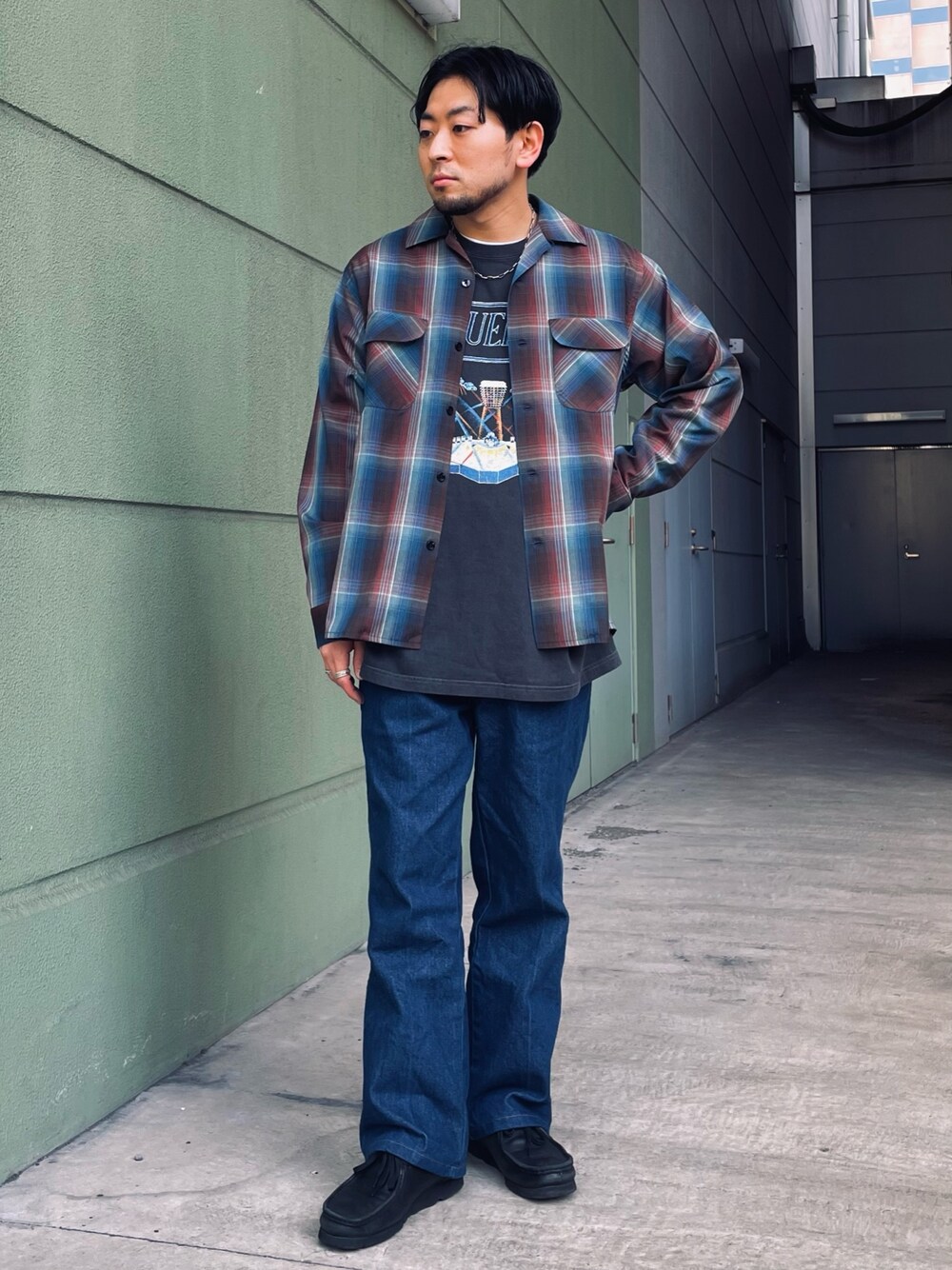 ペンドルトンのオープンカラーチェックシャツに バンドTを合わせた古着風コーデ。 柄アイテム×柄アイテムの重ね着も配色を合わせれば問題なし。