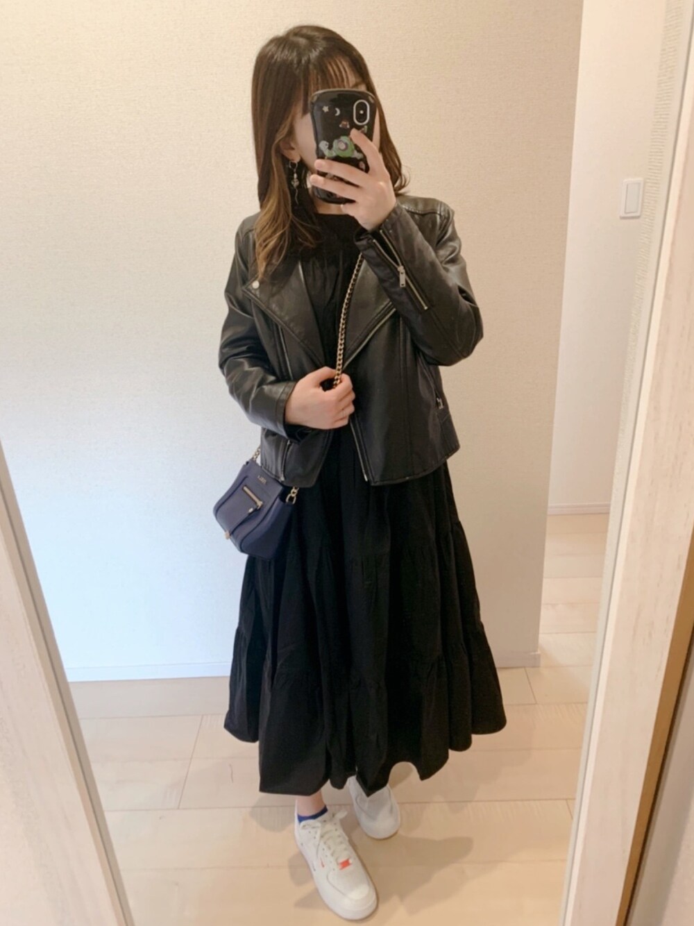 k.m♡mamaのライダースジャケット「フェイクレザーショート丈ダブルライダース」を使ったコーディネート
