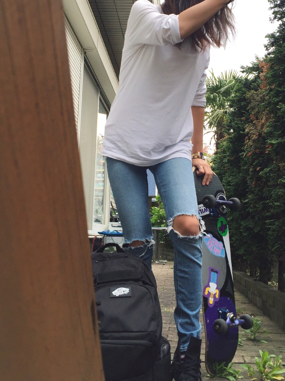 すこーし肌寒い日でも、荷物になるのが嫌だからジャケット着ない😹👍🏼 ダメージスキニーに大きめの白T. それにストリートスニーカーとリュック背負えばシンプルにかっこいいスタイルできるよ!:)