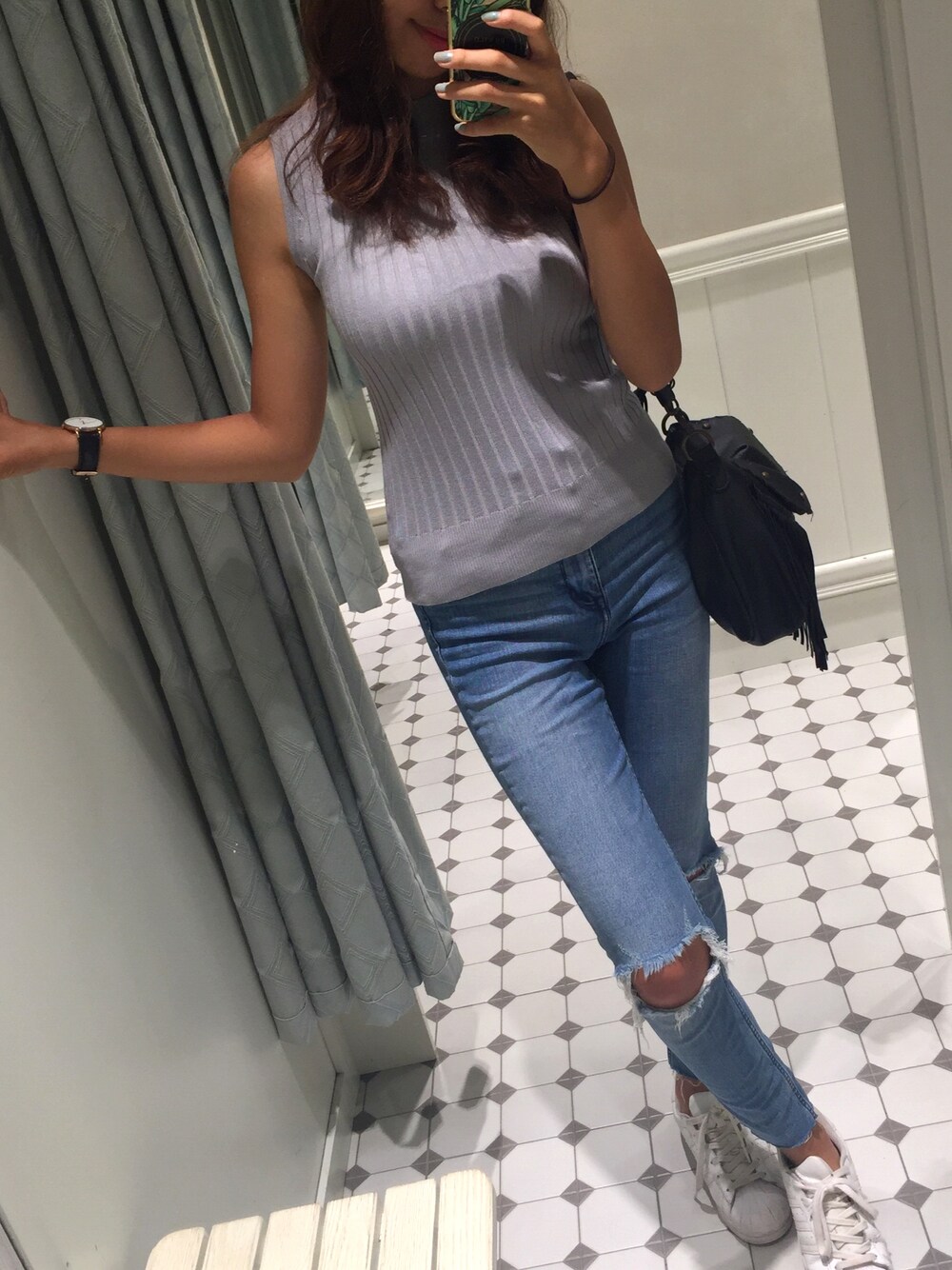 シンプルの日♡ ダニエルウェリントンのは新しいやつ! 針が深い青でクロコダイル柄のベルト💯 このトップスとスキニーは身長が高く見える組み合わせだからとっても好き!☺️