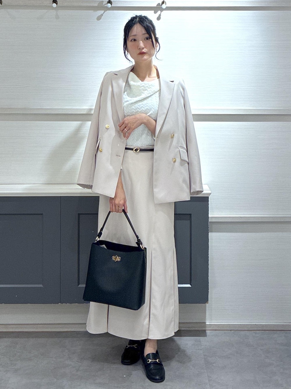 こんにちは! ご覧頂きありがとうございます♪ 京都藤井大丸店の長島です☺︎ 待望のPOLOドレープニットを使用したホワイトの優しいワントーンコーデです♡ お洋服がオールホワイトでも雑貨にブラックを持ってくるとボヤけずキリッと上品に仕上がりました♪