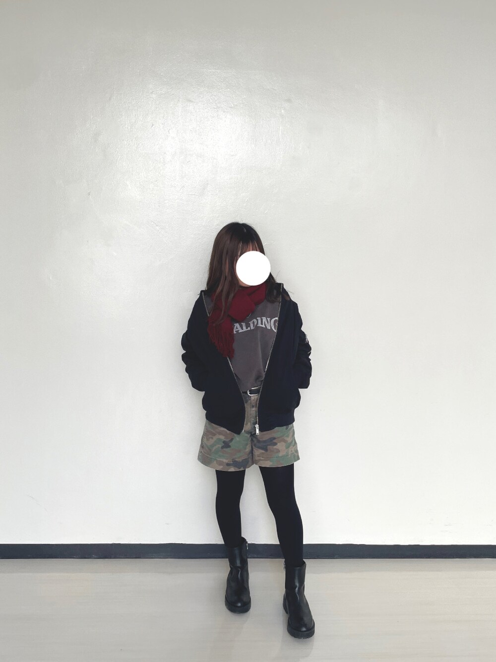 迷彩柄のパンツに冬らしさを感じるスウェットとアウターを合わせてカジュアルコーデ☆ ワンポイントで赤のマフラーを付けて可愛さ気分アップ🎶✊🏻❤️🔥