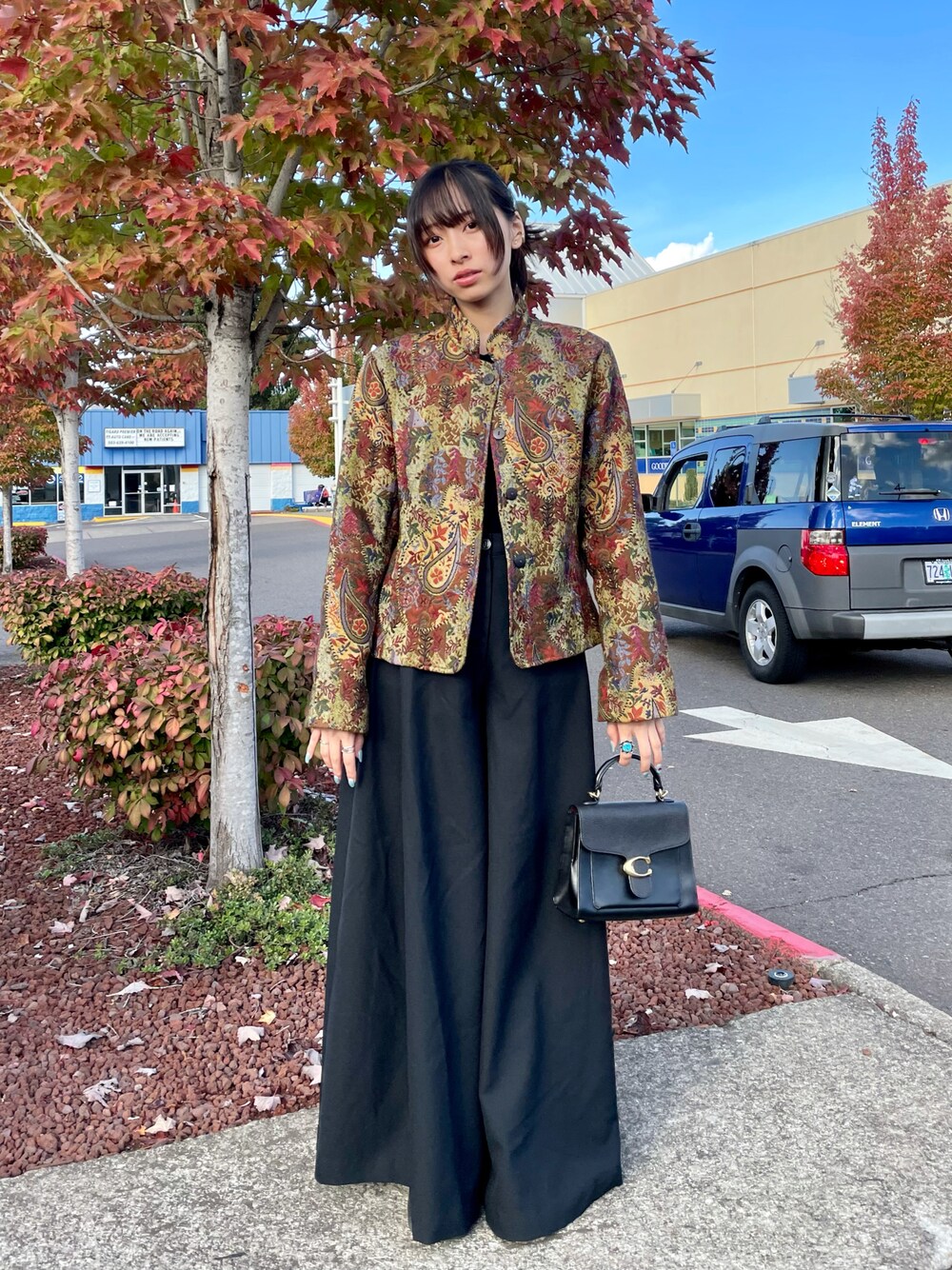 デイとナイトで見え方が変わる刺繍が綺麗なジャケットが特徴的なスタイル🤎 キングフレアパンツが袴みたいでかっこいい🖤色んなアイテムと合わせてスタイルを組んでいきたいっ このジャケットは私のインスタのフリーマーケットアカウントで販売しようと思っていますので気になる方はお声掛けください💞