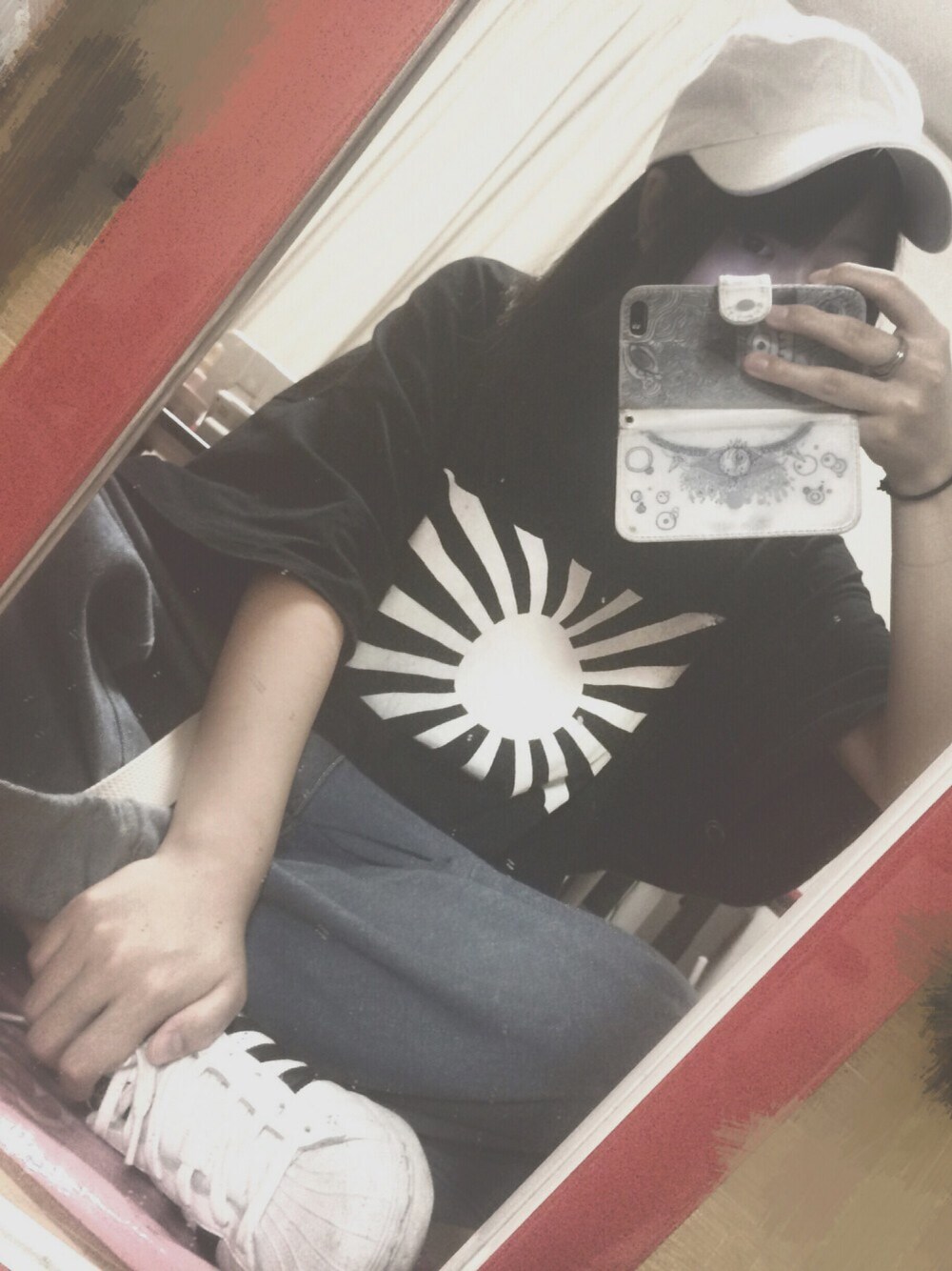 だぼっとゆるっと古着感〜〜! ほとんど見えてないけど白のガチャベルしてるんです。 日章Tがかわいいです。