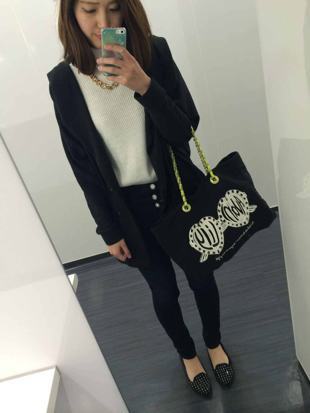 モノトーンコーデ!トップスのみ白を入れて差し色でバックのチェーンが派手めな色のを選びました!