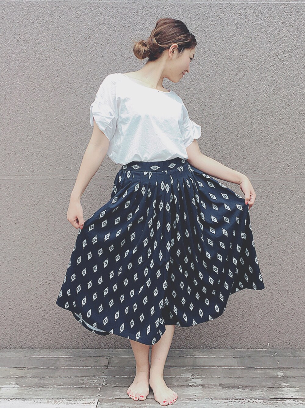 楽チンお出かけコーデ♪ 暑いので髪もラフにお団子。 夏に向けて、楽チンだけどレディなアイテムを探し中💭