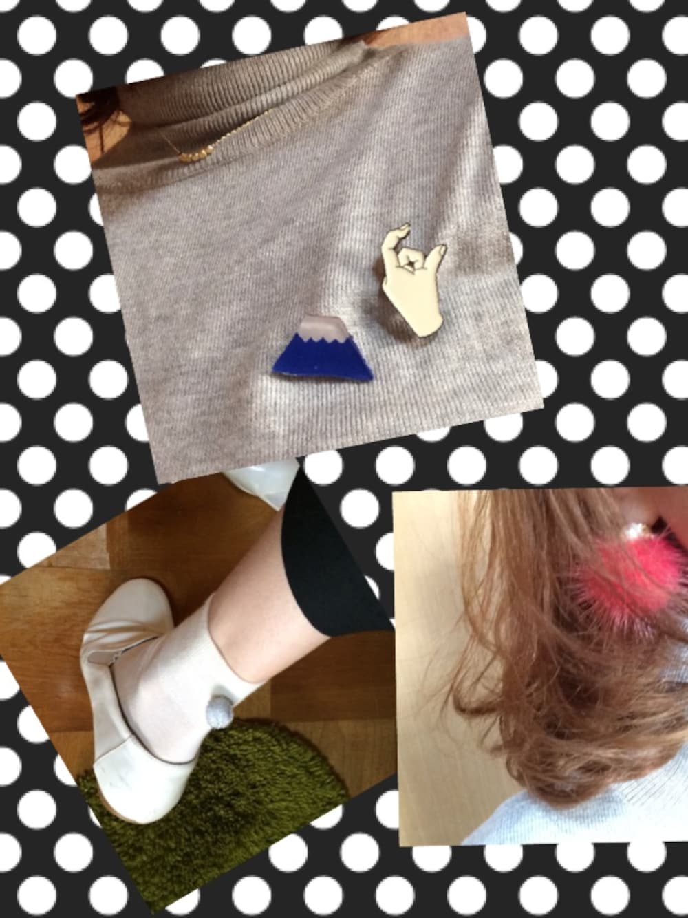 今日のコーデにちょこちょこたしたアクセ。 ショッキングピングに石のついた、かわいいファーピアス。 大好きな手作りさんのです★ くつしたは、前のポンポンタイツにつづき、靴下ー✨ 白だしつかいます! さいごに、富士山と指マークのピンは、100円でかった素人さんの富士山と、指マークはだいすきなcaphの。 富士山かなりきにいってます!