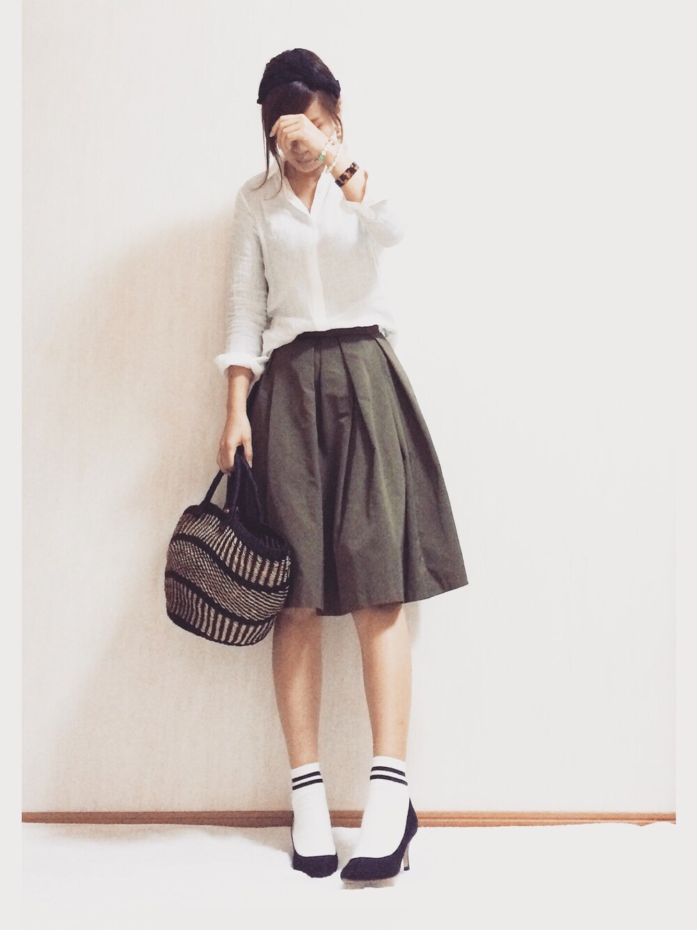 ユニクロのリネンシャツに ふんわりスカート かごバッグ持って気分はフレンチガール♪♪