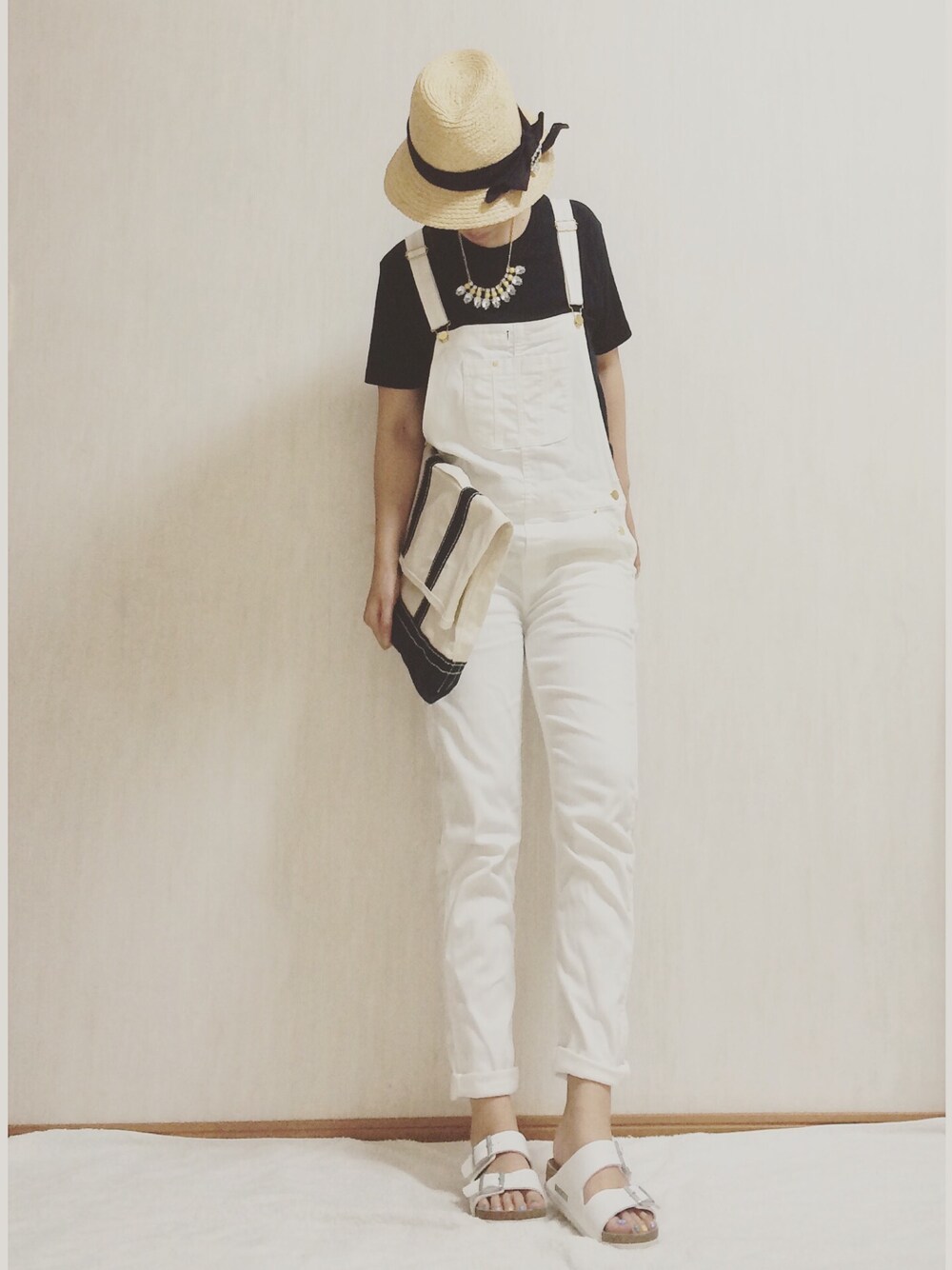 ユニクロメンズパックtee黒に ホワイトサロペット 大好きなモノトーン♪