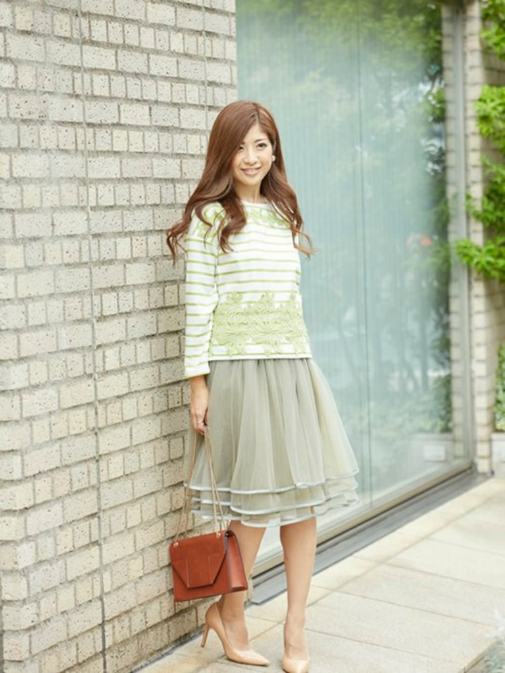 ボーダーの上にレースの刺繍が華やかのトップス♡ ボリュームのあるチュールスカートを合わせて女性らしくコーデしました♪ 落ち着いた色味のコーデなので 大人の女性が楽しめますよ♪