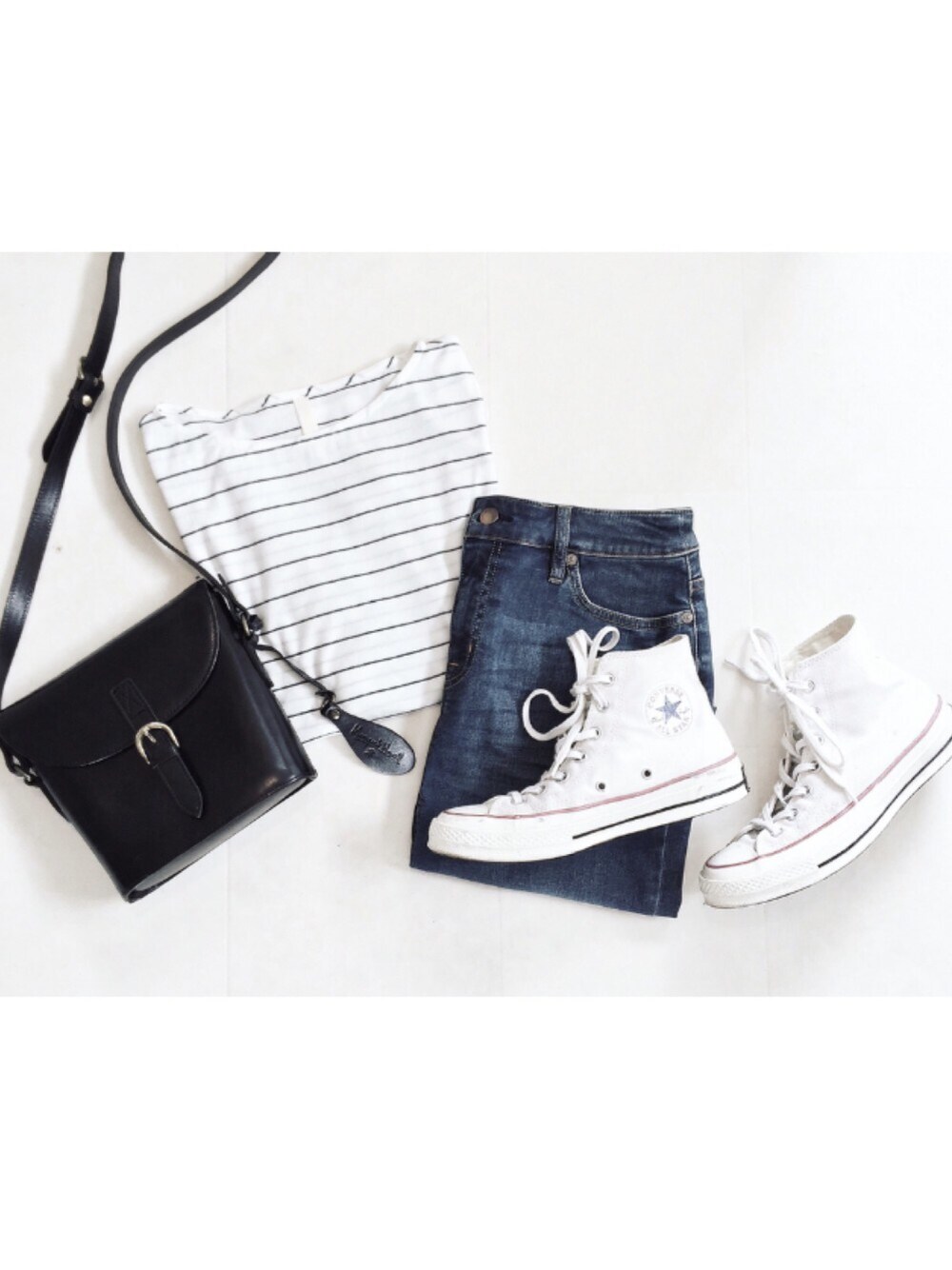 大好きなボーダーは細い線を重ねた繊細なカットソー。 USAのチャックテイラーは履き心地抜群。