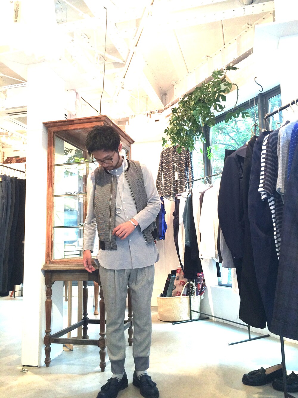 グレーをメインに、締めるところはダークトーンで締めて。 レイヤード感とすっきり感を意識しています。