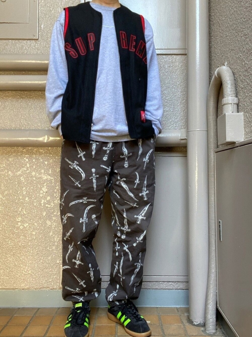 私、本日は有給でございますので、いつも以上にリラックススタイルです。 リラックスウエアの代表格であるスウェットパンツは重い上に、春以降は暑くて着られないという弱点があります。Supremeのスケートパンツはコットン一枚仕立てなので、軽くて、夏でも着られる気軽さが最高です。 今期はスケートパンツが一型も発売されないので寂しいですね。ただ、近年はマイルス・デイビスの総柄などちょっと着るのに勇気がいるデザインだったので見送っていましたが。