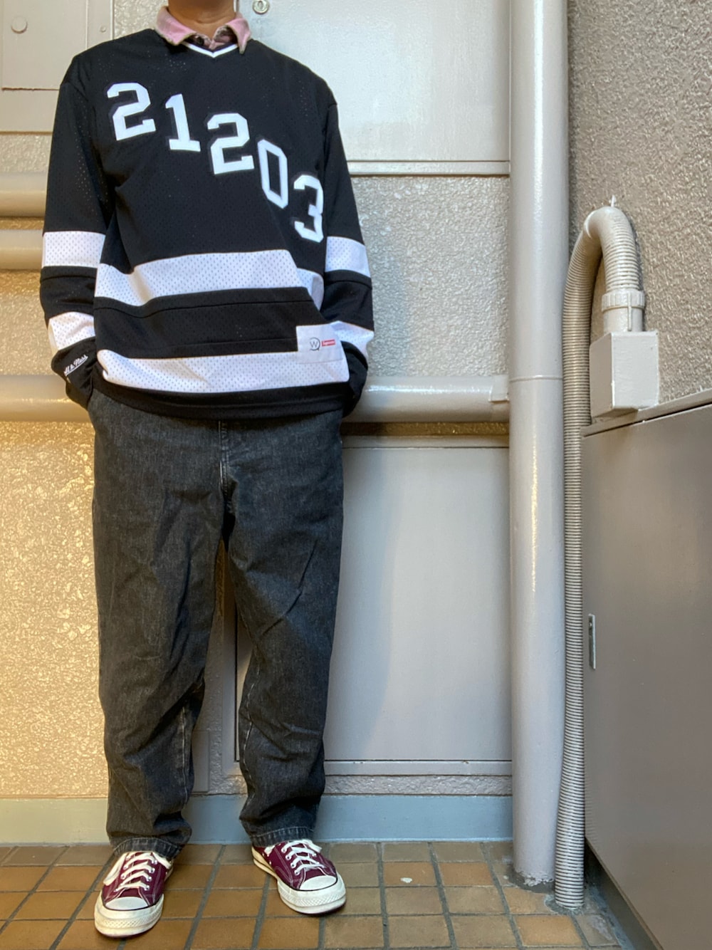 ホッケージャージのインナーにネルシャツを合わせることで、スポーツ感を減らしました。