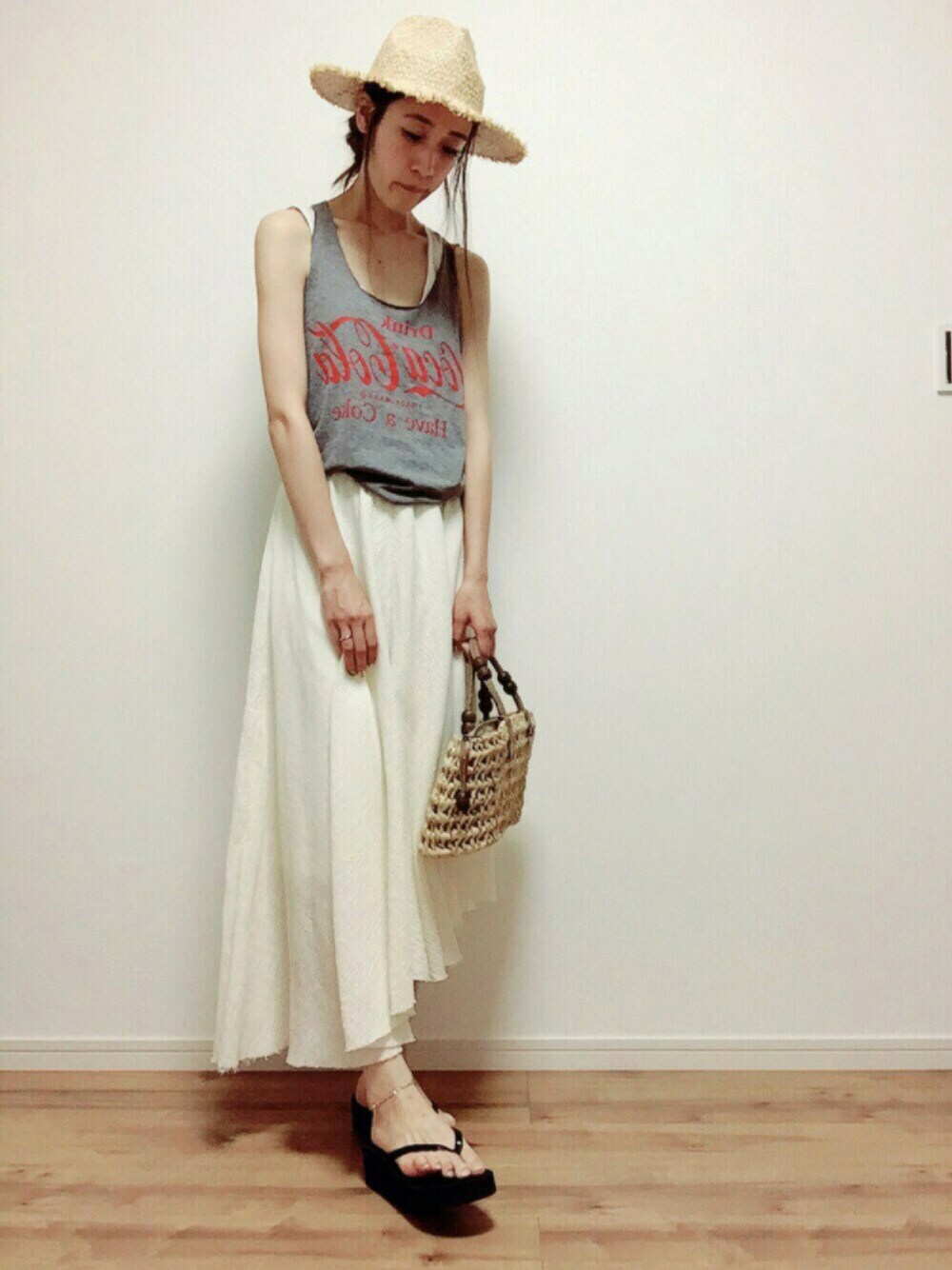 ホワイト系のスカートを着用したレディースの夏コーディネートの1枚目の写真