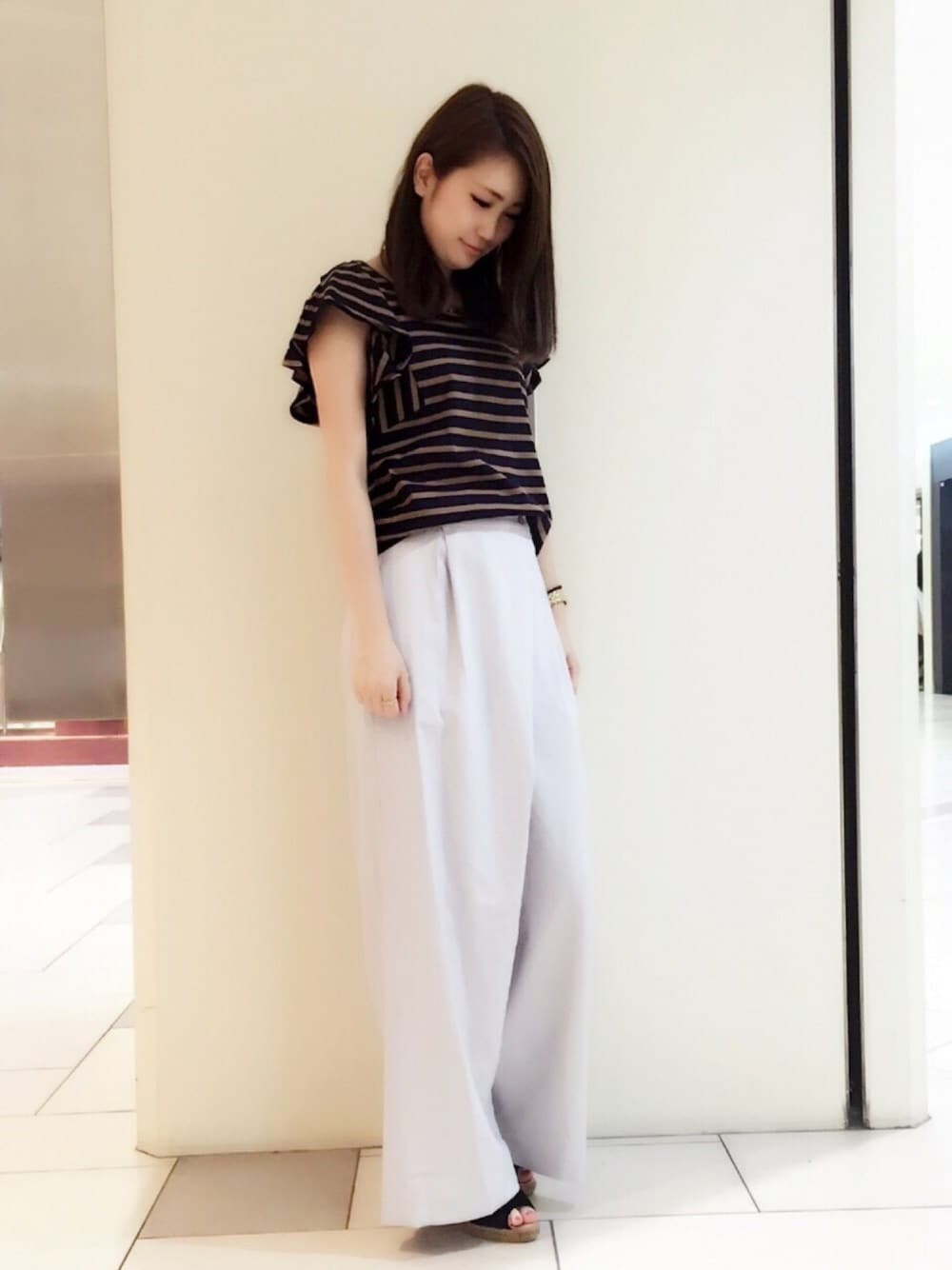 ちょっと先取りの夏コーデ💕 定番のボーダーブラウスに お袖のフリルがついて可愛いですよね😻 ワイドパンツもすごく動きやすく ブラウスやTシャツとも相性抜群です💕