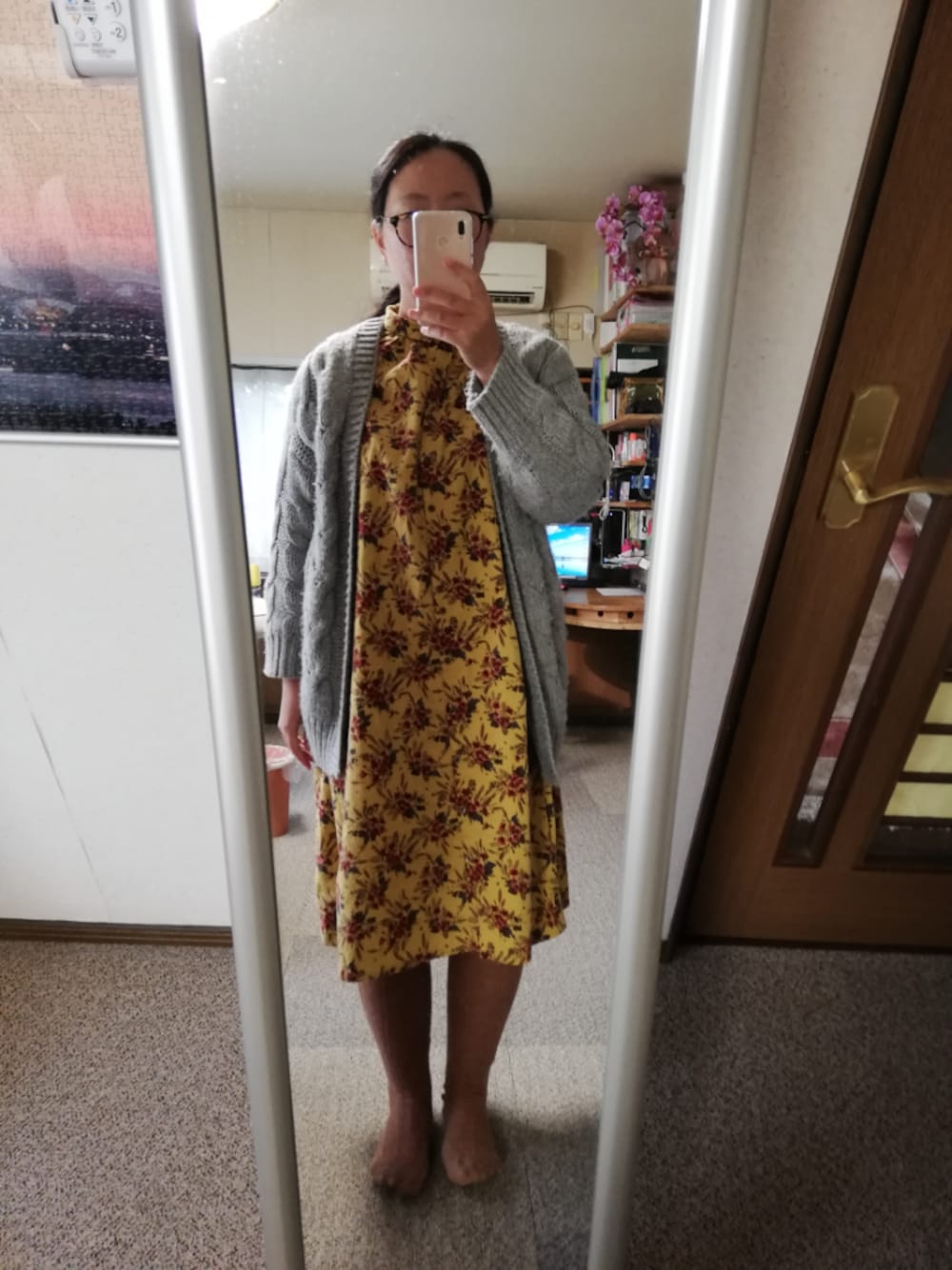 アロハシャツのようなシャツワンピースです(笑)外に出るときはsamansa mos2のカーディガンやコートをはおります。