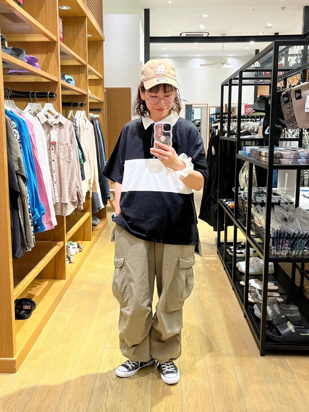 moco(BAYFLOW モレラ岐阜)のカーゴパンツ「ナイロンコットンワイドカーゴパンツ」を使ったコーディネート